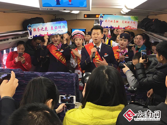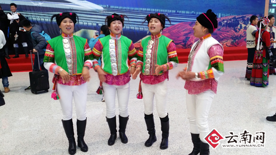 开心写在每一个人的脸上。一早,昆明南站西广场摆放着各式各样的鲜花,云南25个少数民族群众满怀喜悦的心情,前来体验首趟高铁动车。在西广场上,云南少数民族群众手拉手,唱起了云南民歌《远方的客人请你留下来》,纳西族代表演奏了《纳西散步曲》;彝族少男少女跳起了欢快的《左脚舞》……走进昆明南站宽敞明亮的候车区,民族群众按耐不住心中的喜悦,与铁路“金花”客运员尽情歌舞。哈尼族优美的《哈尼乐作》,藏族欢快流畅的《弦子舞》,吸引了众多旅客驻足观看。