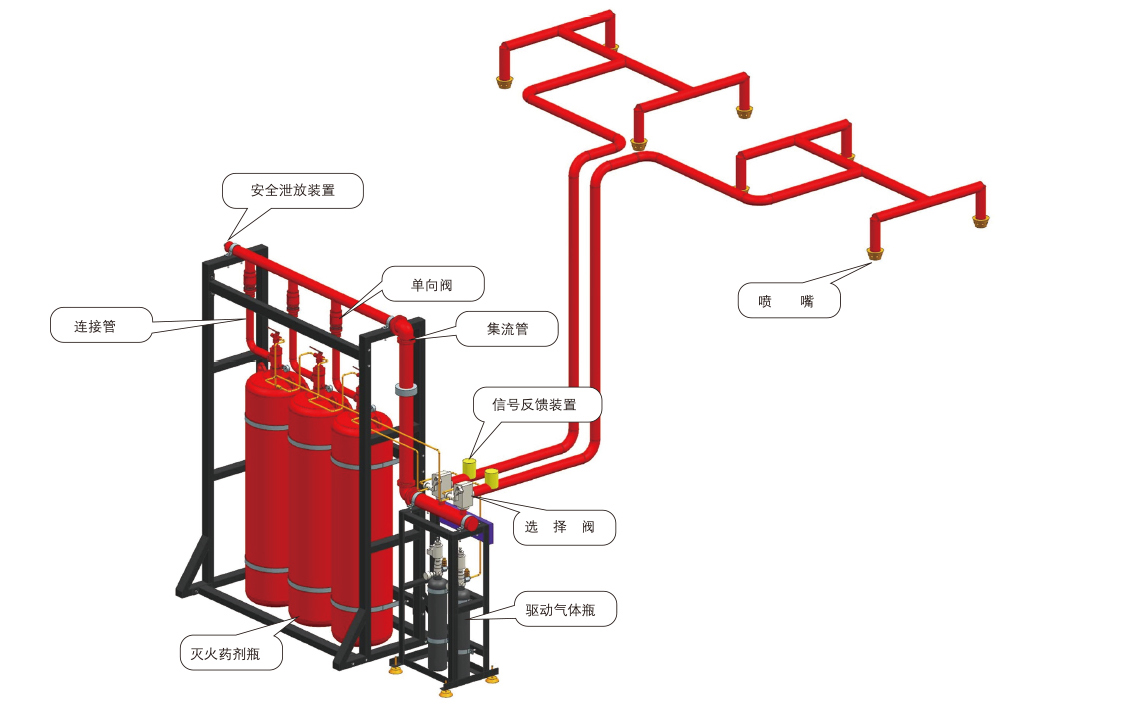 IG-541混合气体自动灭火系统主要由:气体灭火报警控制系统、火灾探测系统、灭火剂贮存瓶、容器阀、选择阀、减压装置、单向阀、气路控制阀、压力开关、喷嘴、管路等主要设备组成。可组成单元独立系统或分配系统等多种形式。实施对单区或多区的消防保护。